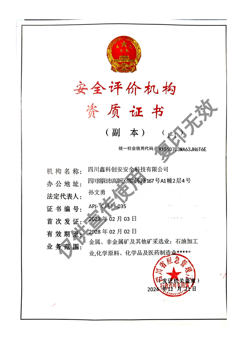 四川鑫科創(chuàng)安安全科技有限公司成立于2020年,是川北地區(qū)取得資質(zhì)的民營安全評價機構(gòu)(資質(zhì)證書編號:APJ-(川)-035)。并于2022年牽頭成立綜合應(yīng)急救援隊伍 - 綿陽曙光應(yīng)急救援中心。